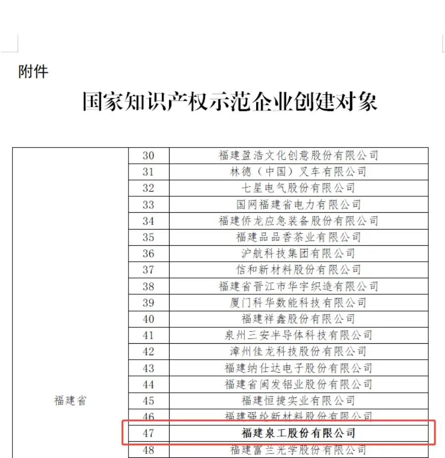 Récemment, l'Administration nationale de la propriété intellectuelle (CNIPA) a publié « l'Annonce sur les résultats de l'évaluation des objets de création de démonstration de construction de pays fort en matière de propriété intellectuelle nationale ».Fujian Quangong Machinery Co., Ltd.a été sélectionné avec succès comme « Objet national de création d'entreprise de démonstration de propriété intellectuelle pour 2025-2027 » sur la base de sa force globale en matière de création, d'utilisation, de protection et de gestion de propriété intellectuelle. Cette sélection réussie signifie une reconnaissance faisant autorité au niveau national des efforts de Quangong Machinery Co., Ltd. pour promouvoir le développement de la propriété intellectuelle de haute qualité et servir la stratégie nationale visant à construire une nation forte en matière de propriété intellectuelle.