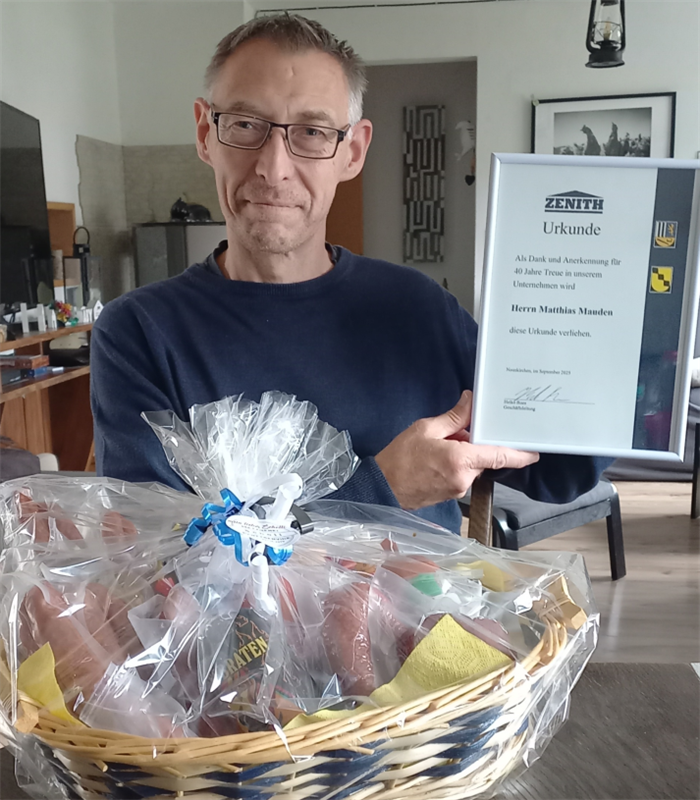 M. Markus Türk, âgé de 47 ans, fête également son 30e anniversaire. Il a suivi une formation de commis industriel de trois ans chez Zenit et est actuellement chef du service des ventes de pièces détachées. Depuis de nombreuses années, il fournit un service après-vente efficace à des clients mondiaux dotés de solides compétences commerciales et d'un sens des responsabilités, garantissant ainsi le fonctionnement de haute qualité du système de service de l'entreprise.
